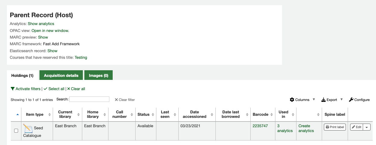 When the "Analytics" tab is clicked, Koha will display a few more columns to show the details of the linkage. Here is a view of the Child record when "Analytics" is clicked: