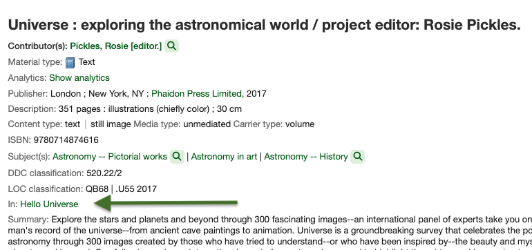 Below is how this would look in the staff interface, and clicking "In: Hello Universe" would bring up the other linked record.