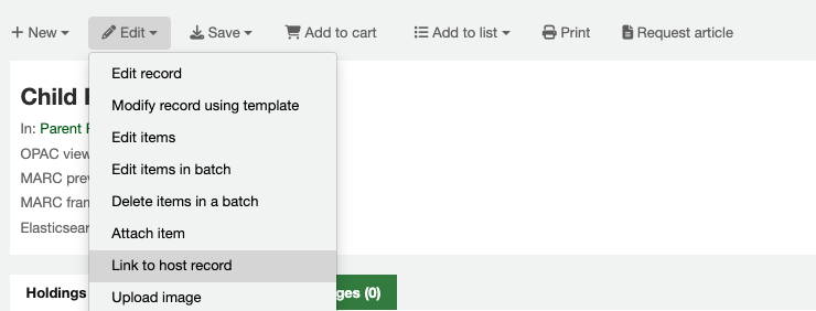 Once you have two bibliographic records ready to be linked together, you will have the ability to do this using a barcode. The Parent record can have one or multiple items attached, while the Child record can have up to one item attached. From the Child record, click Edit and choose the option to Link to host record. You will then be prompted to enter the barcode of the Parent item.