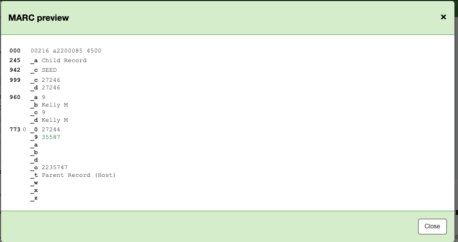 Rather than using the process we previously outlined, a library can manually add the information of the Parent record into the Child record. This information would be filled in the 773 MARC fields, as described above.
