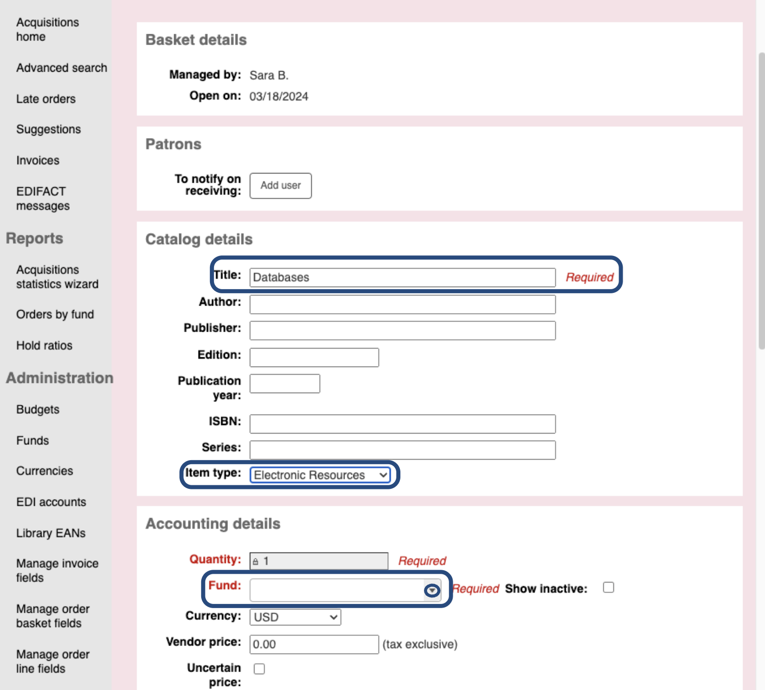 The instructions below assume familiarity with Koha's Acquisitions module, including creating budgets, vendors, and baskets, working with invoices, and receiving orders. Please see the Koha manual for instructions on general Acquisitions use/features.