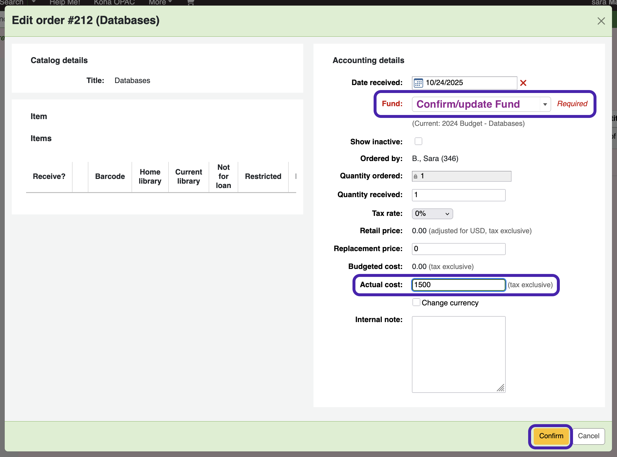 - Add the cost for this order in Actual cost. This Actual cost is what will be reflected in the Fund you select on this screen.