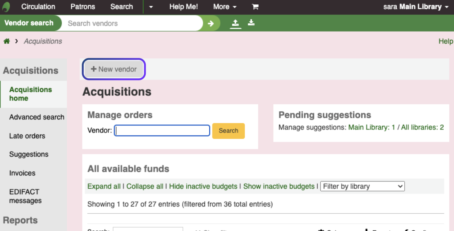 In Acquisitions, start by creating one or more vendors with the '+ New vendor' button. Depending on how your library wants to view and report on electronic resources, you can add each actual vendor (ex: Kanopy) or one vendor per type of electronic resource (ex: Streaming).