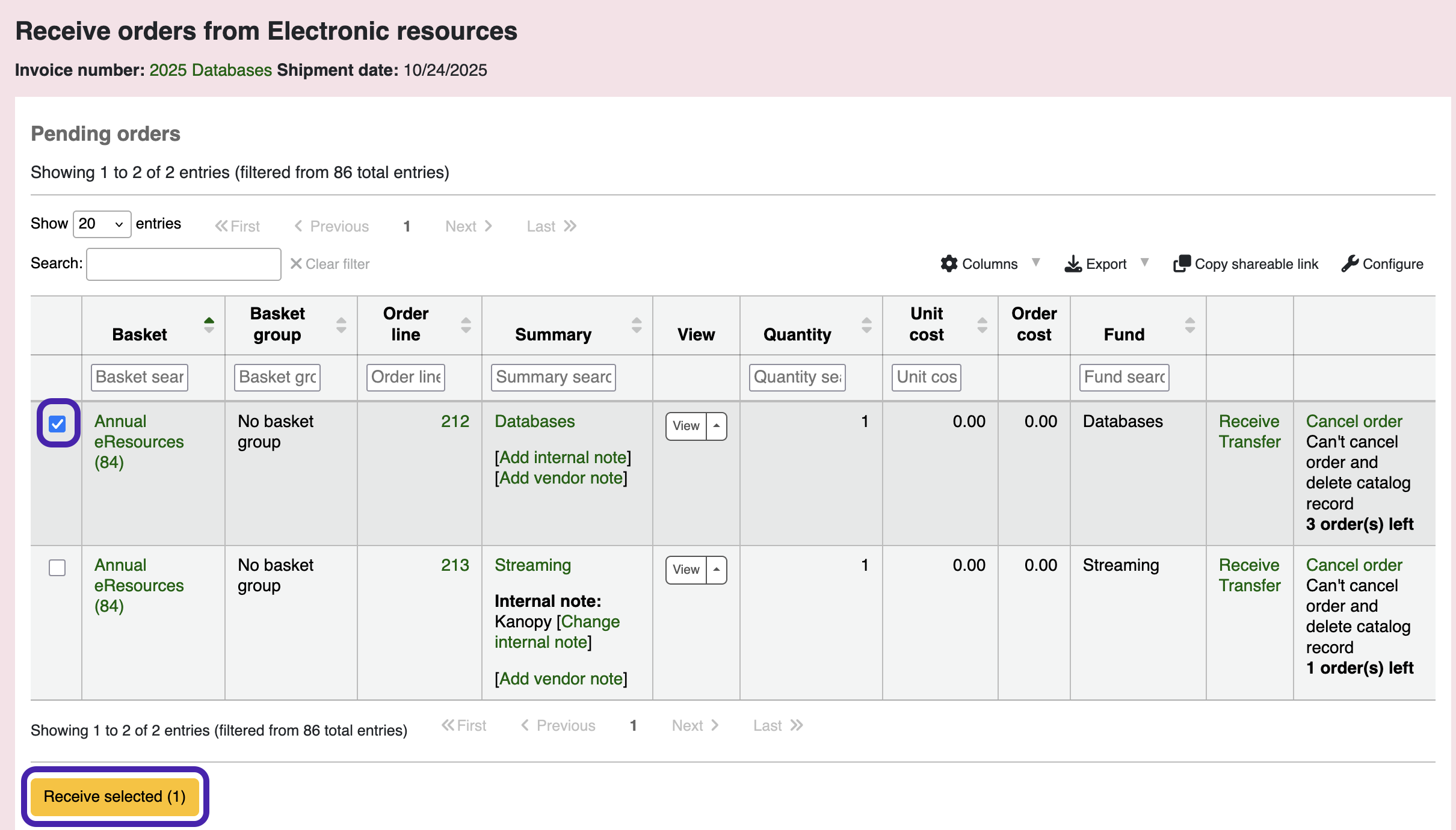 Select the order lines you want to charge to your budget, then click 'Receive selected'. (If you are only receiving one order line, you can click the 'Receive' link in that single line.)