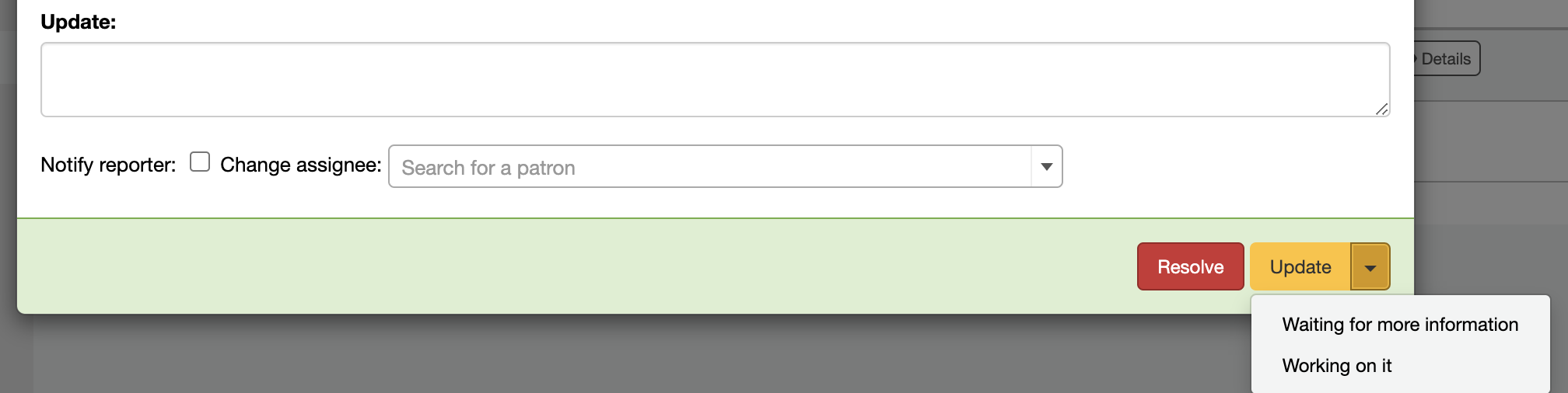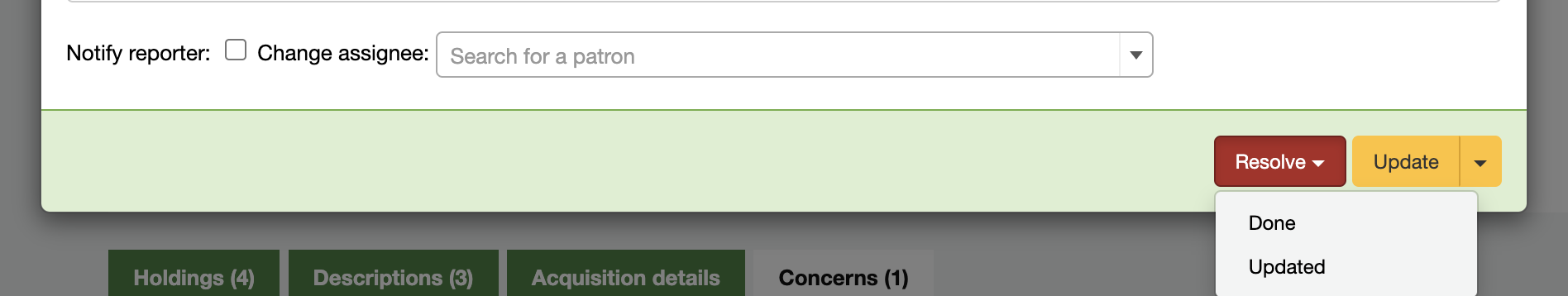 The system preference OpacReportProblem must also be enabled, and email addresses for the intended recipients of the concern should be entered in the CatalogerEmails system preference. Notices can be sent out about these concerns, these notices include TICKET_NOTIFY, TICKET_ACKNOWLEDGE, TICKET_RESOLVE, and TICKET_UPDATE. These notices have default language present, however libraries can alter these.