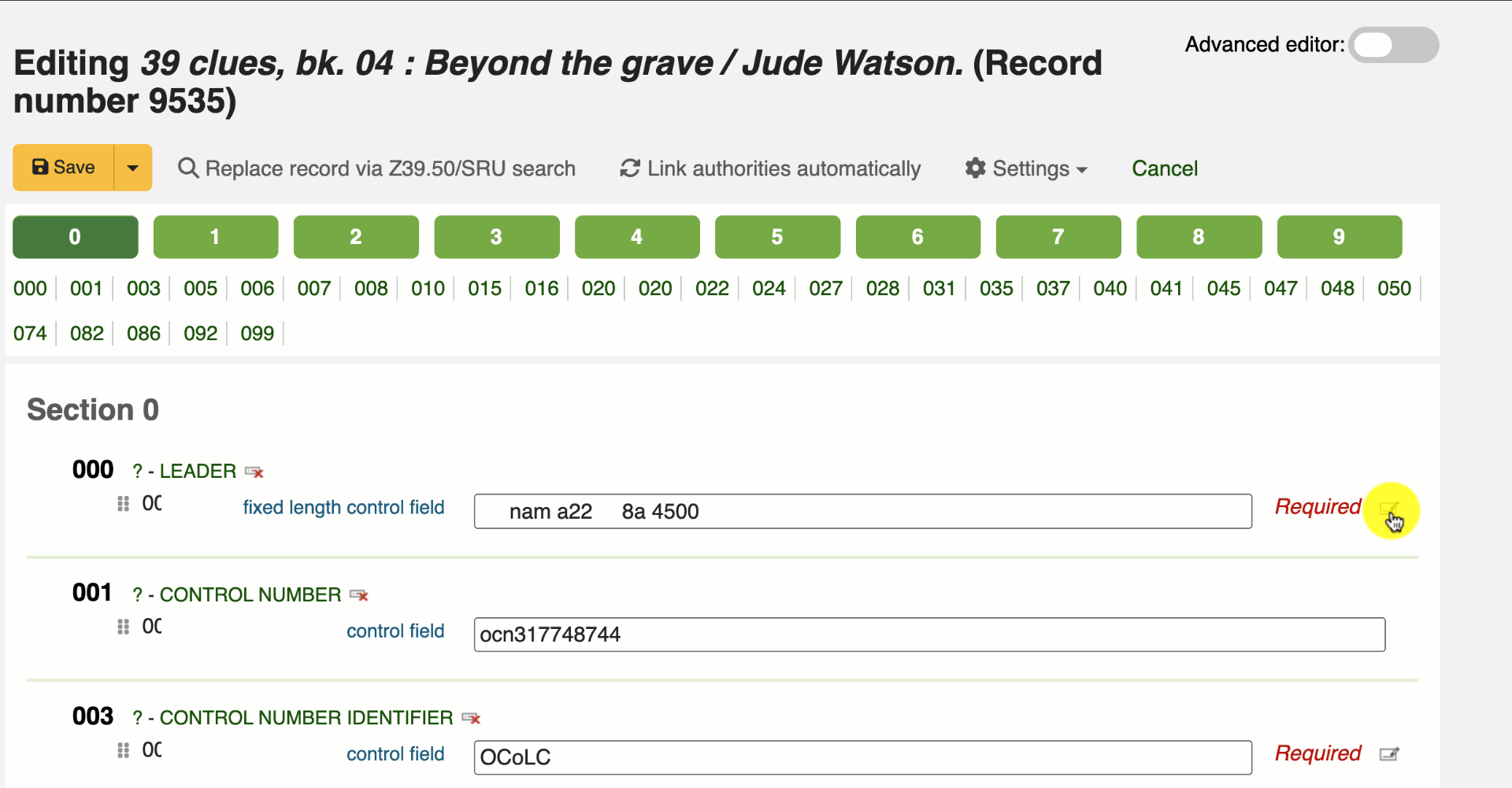 Edit the tag to add the correct values for the record. Alternatively, Koha can add default values when the tag editor is saved without editing. Click on the save button in the modal window.