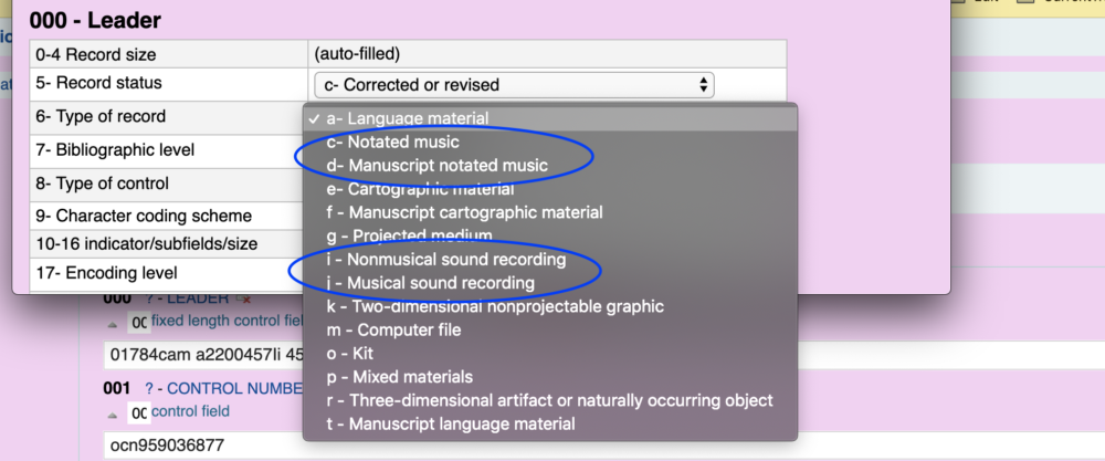 However, if you make a change to the material type in the 008 and try to save, you may find your changes don't stick. The 008 material type is driven by information in the Leader/06. A pop-up helper in the basic editor does also provide a hint to that link: "Select a type of material to specify the variable values. Default selection is based on value in Leader/06." However, the Leader/06 is what actually determines the value in the 008, so a change to material type needs to begin with editing the Leader/06.