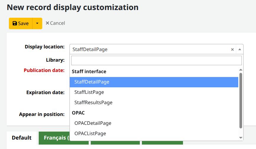 The bibliographic record display depends on a XSLT stylesheet on the server where the fields and visual appearance of the record is coded. This stylesheet is difficult to customize when a library would like to display additional fields and subfields. Bug 39860 introduced a new Record Display Customization option found in Tools. This new customization option uses template toolkit code to insert additional code into the stylesheet. Template toolkit provides some powerful options for adding custom fields and sub-fields to the bibliographic detail view, lists results, and search results of the staff interface and OPAC.