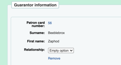 Koha has the ability to link patrons. This type of linking is for financial responsibility over materials and fines. An example of these linked relationships are parent-child, organization-employee, and others. These relationships are called Guarantors and Guarantees.