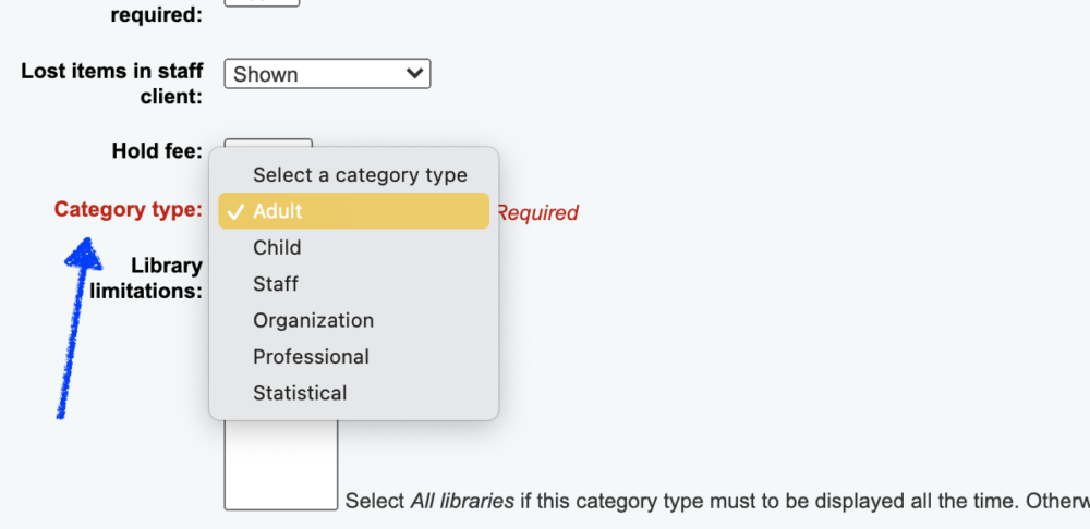 When creating a new patron category, a category type must be associated with it. The options are Adult, Child, Organizational, Professional, Statistical, and Staff. Any Adult Category can be set up to allow for guarantees. This relationship will work similarly to a Child/Adult relationship in Koha.