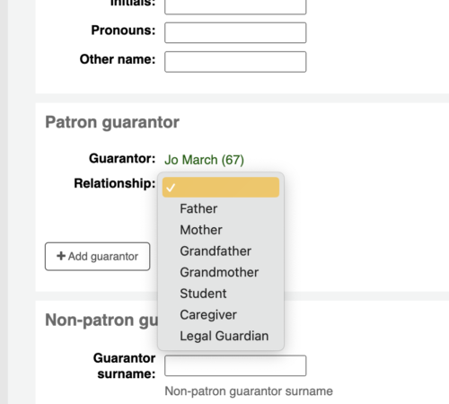 The values in this dropdown come from the system preference, borrowerrelationships. The options that are added into this system preference will appear in the dropdown. If a pipe | is added in front of the values, then there can be an option for "not defined". A library can include other choices within the borrowerrelationship system preference. Adding more choices in this system preference will show up in the relationship dropdown.