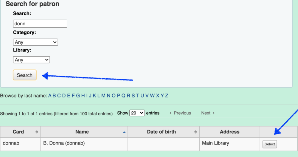 If a guarantee is already in the system, and the library would like to link this existing guarantee to a guarantor. Editing the patron record, the "Search to Add" option will appear here. The only guarantors that will appear in this search will be Adult patron category types.