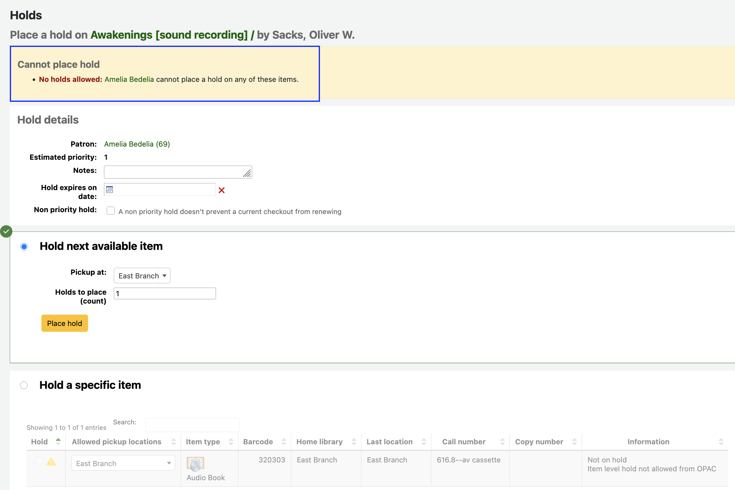 matrix or 'Checkout, hold policy by patron category' settings. Please see 'Placing holds by override' below for further details and examples.