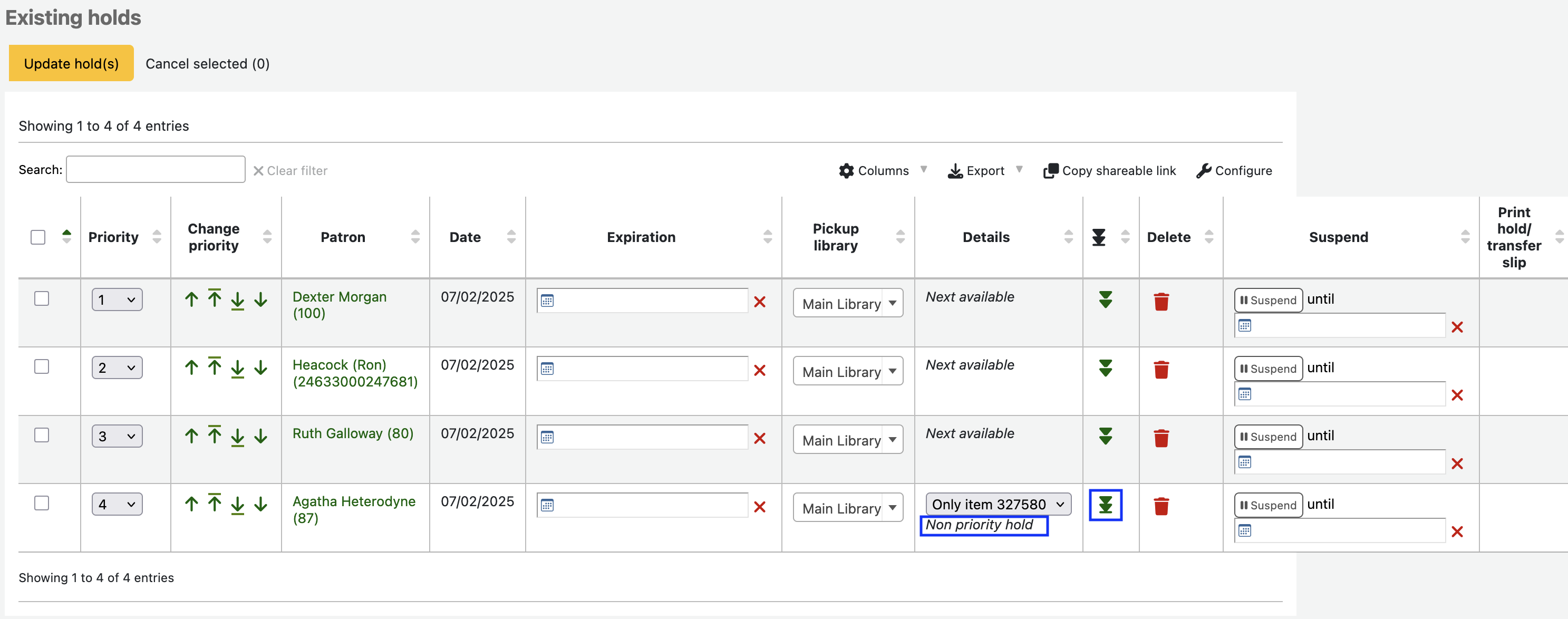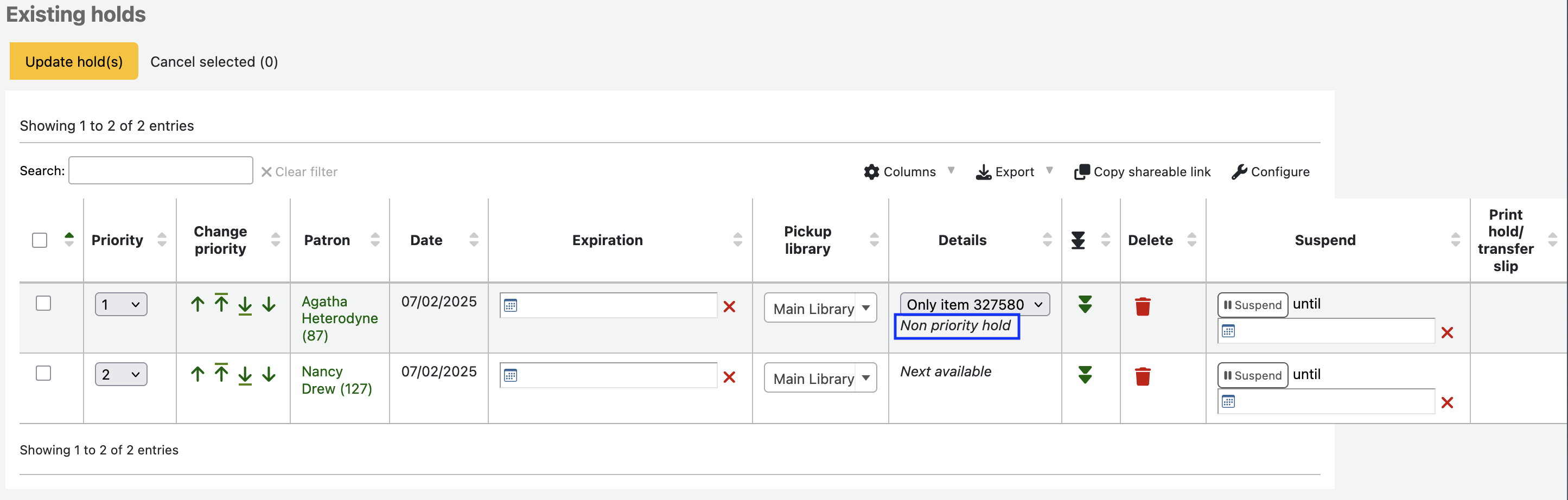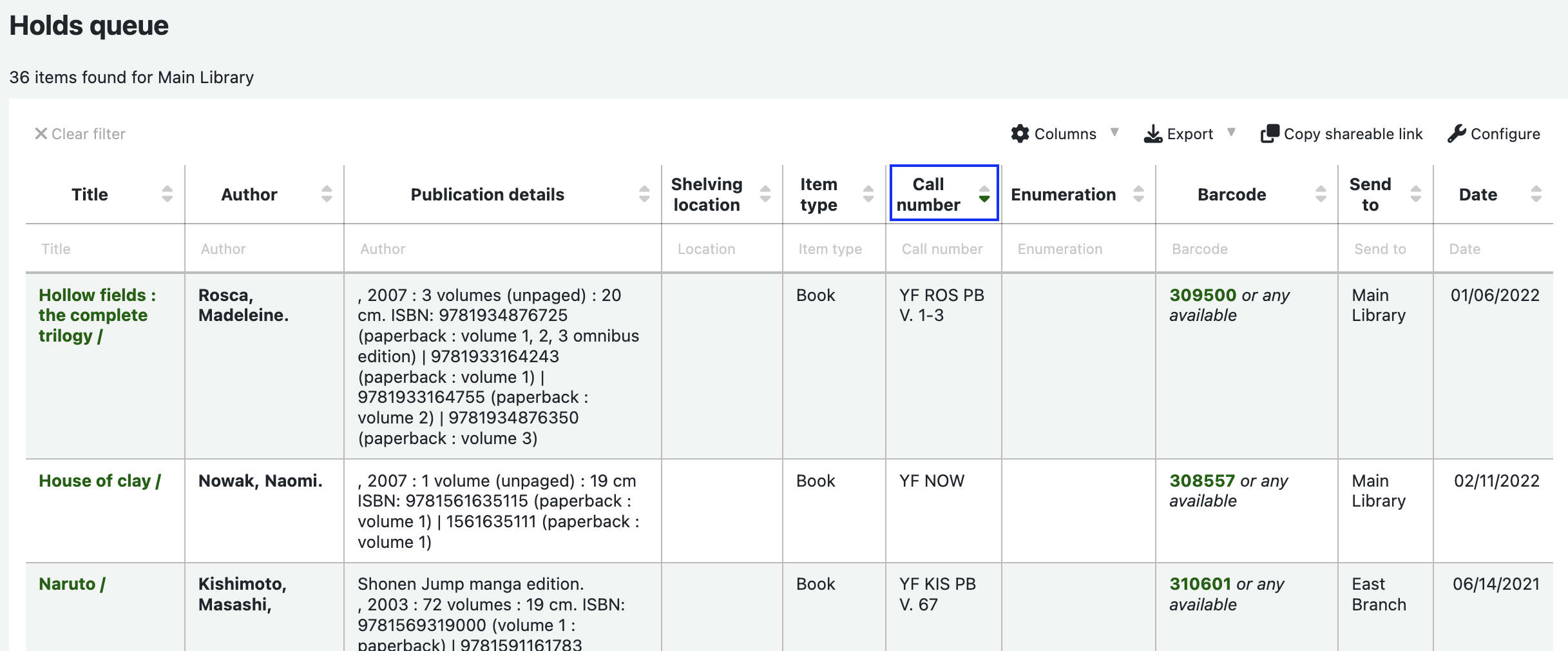 Please see the manual for details on using the Holds to pull report. Note that this table can also be sorted by clicking on column headers, and filtered by making a selection or typing in the field below each header.