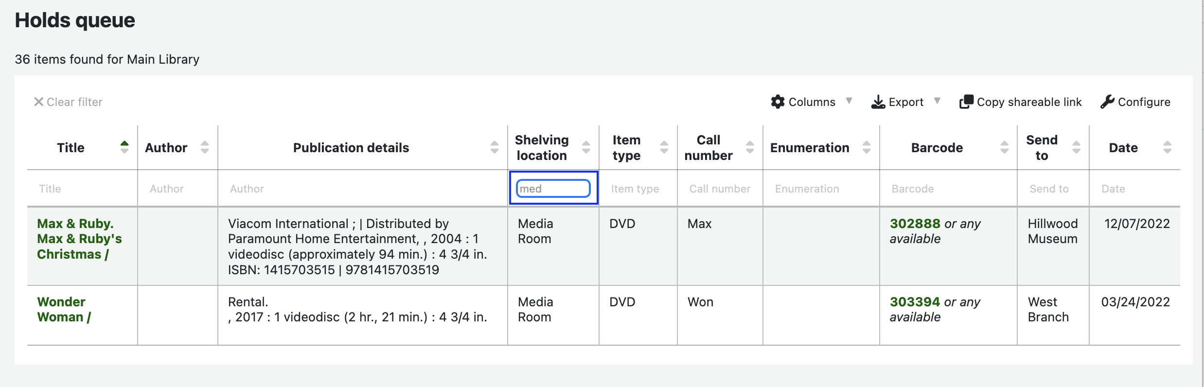 Staff can also type in the blank row under the header columns to filter. This is useful if, for instance, your library prints the report and wants to give specific shelving locations to different staff members: