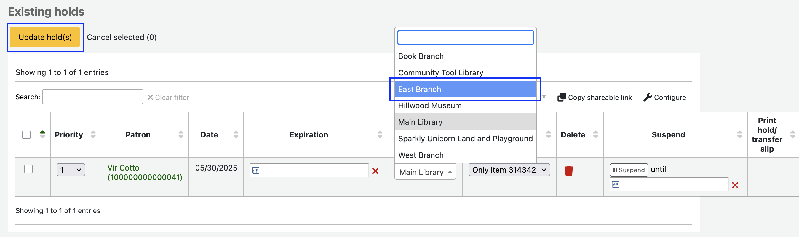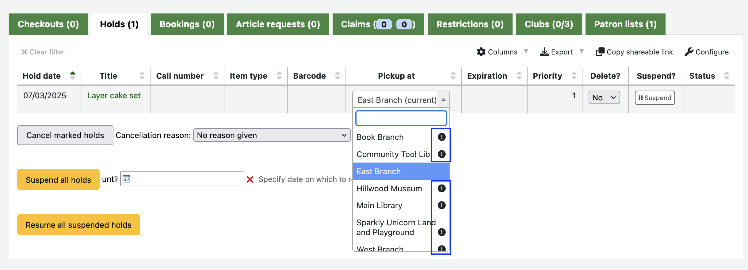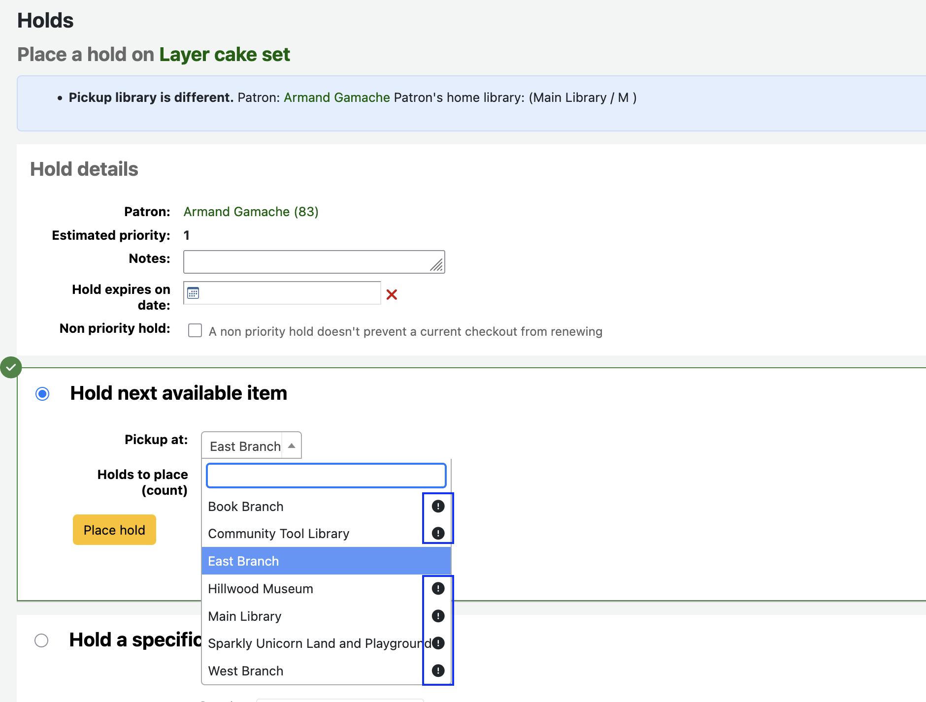 If staff tries to change the pickup location of a hold to an invalid library, they will see the same black circle with a white exclamation mark noted above for placing holds: