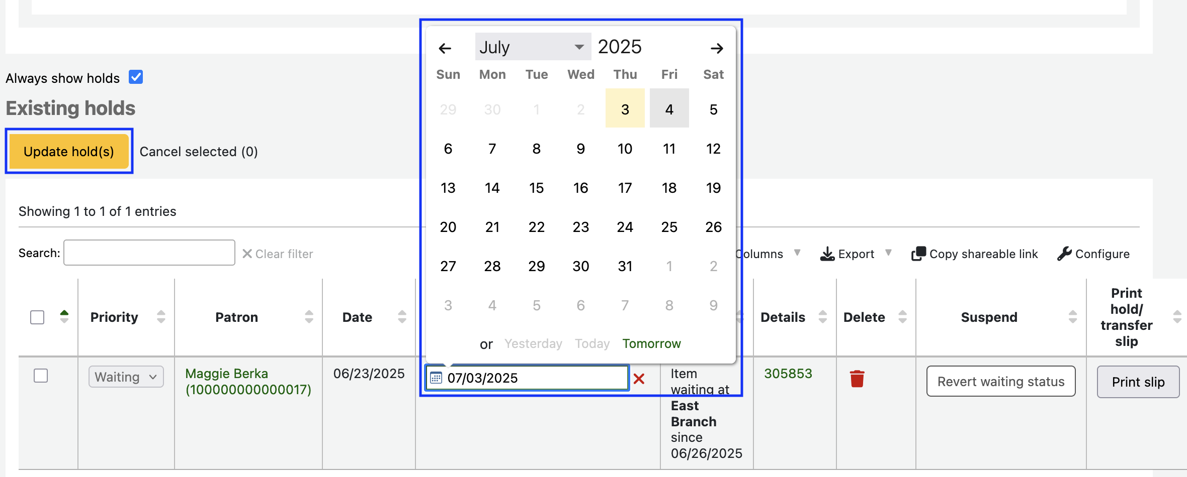 Libraries can change the expiration date on a filled hold from the Holds tab of the bib. For instance, if a patron's item will be held until Tuesday but they call and ask that it be held until Thursday, the library can extend the date.