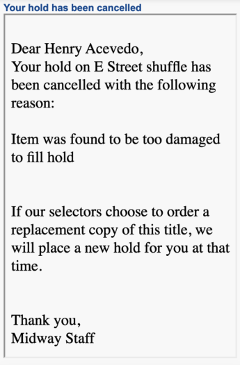 Like many other notices, HOLD_CANCELLATION can be written with Template Toolkit to give it added flexibility. For instance, a library might want to add a line stating that if a hold was cancelled due to a damaged item and a replacement copy is ordered, a hold will be placed at that time. That would look like this: