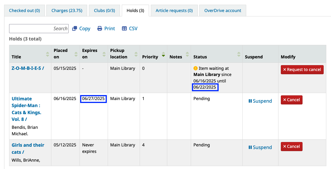 Patrons can use the 'CSV' button to export a .csv file of their holds, the 'Copy' button to copy/paste the table into a spreadsheet, or 'Print' to print their table.