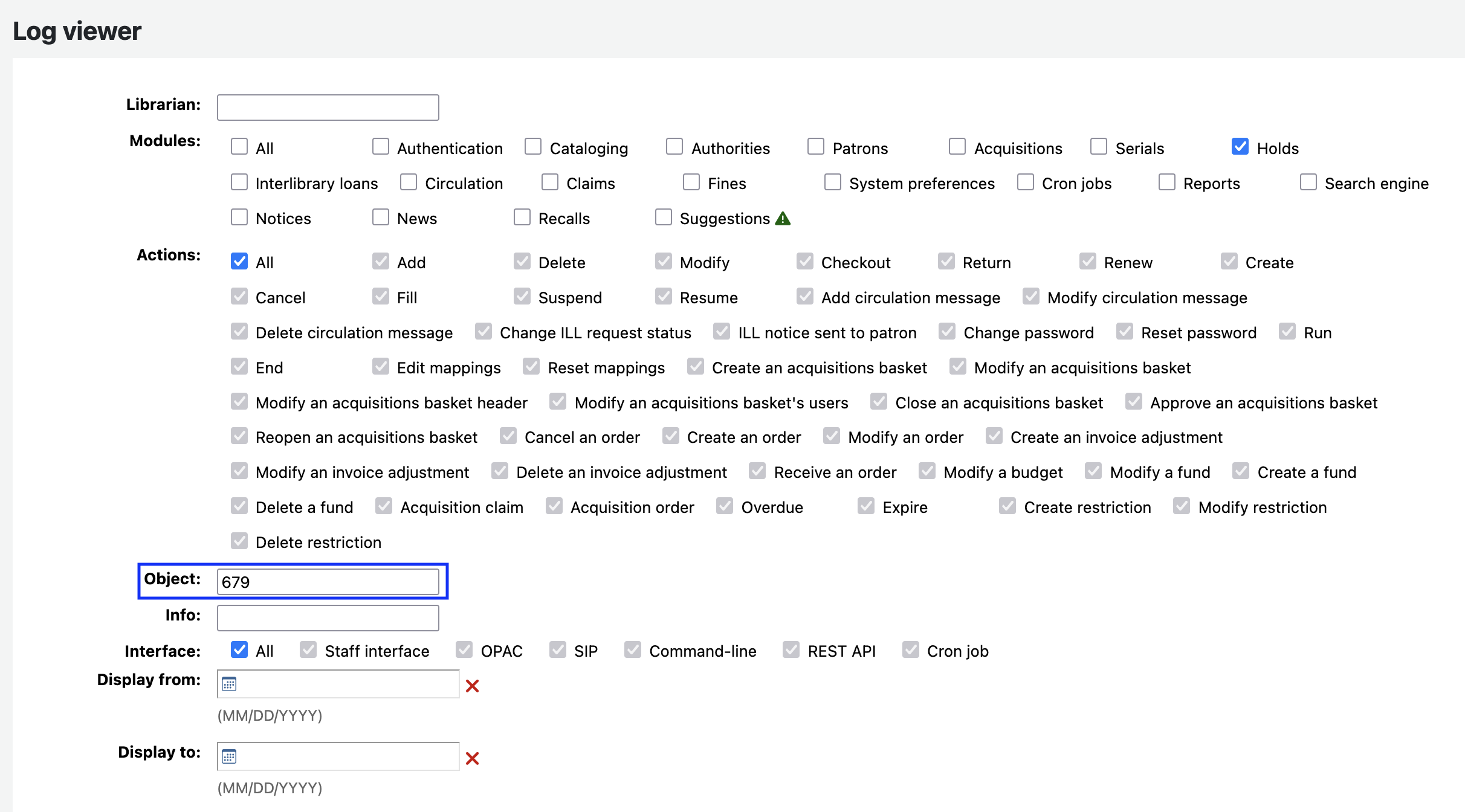 Koha's action logs are powerful tools for solving circulation mysteries, but using them to view hold activity requires an extra step before searching the holds log. For searching circulation logs and cataloging logs, we can use borrowernumber or biblionumber as the object to see the respective history, but the holds log uses a unique identifier that is harder to find: the reserve_id.