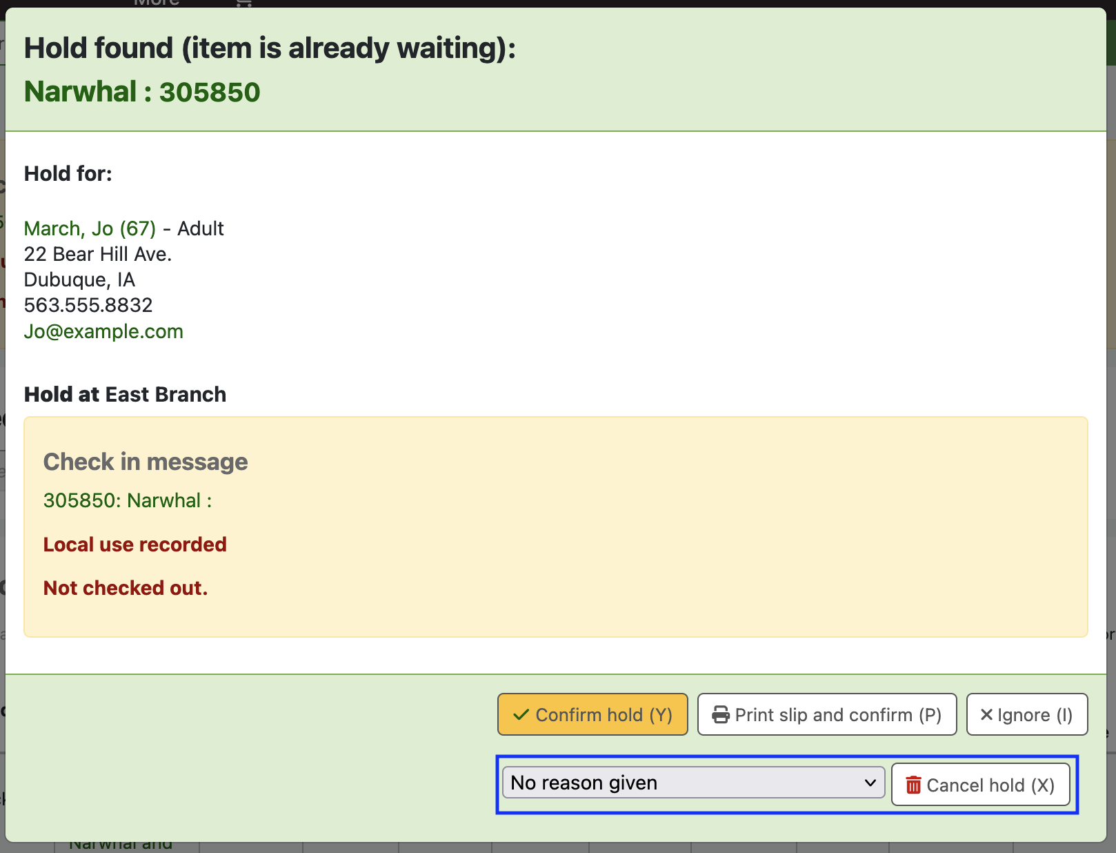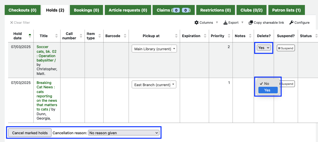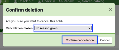In addition to the ability to mark an item as lost (and optionally notify the patron) with the 'Mark item as lost'/'Mark lost and notify patron' button in the 'Action' column, staff can cancel holds by clicking 'Cancel hold'. If they select a reason, the patron will receive the 'Hold cancellation' notice.