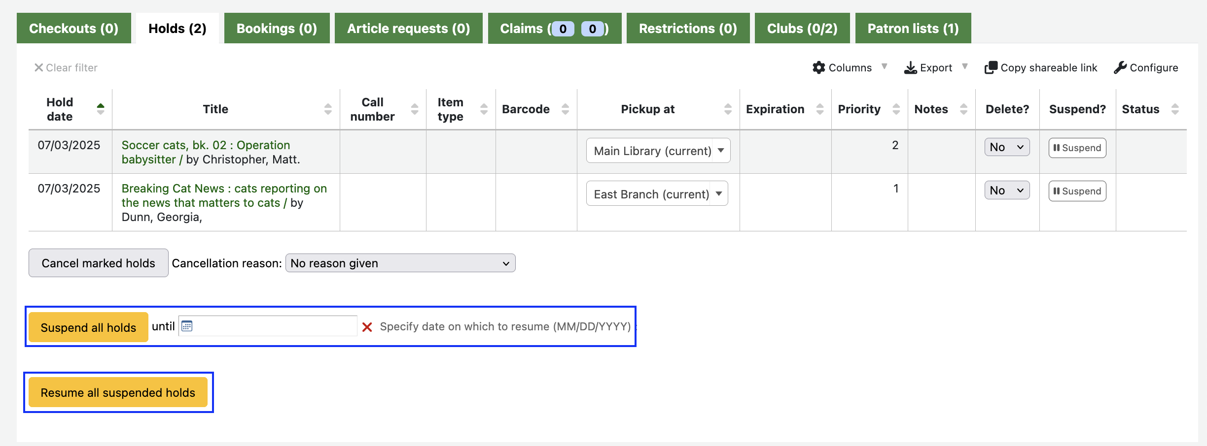 For holds that have been suspended and later unsuspended, note that Holds to pull only looks at the date a hold was placed, not the date it was unsuspended. For instance, if HoldsToPullStartDate is set to 30, and a hold was unsuspended 15 days ago but originally placed 60 days ago, it will not show up on Holds to pull. Staff would need to change the 'Start date' in 'Refine results' to capture that unsuspended hold.