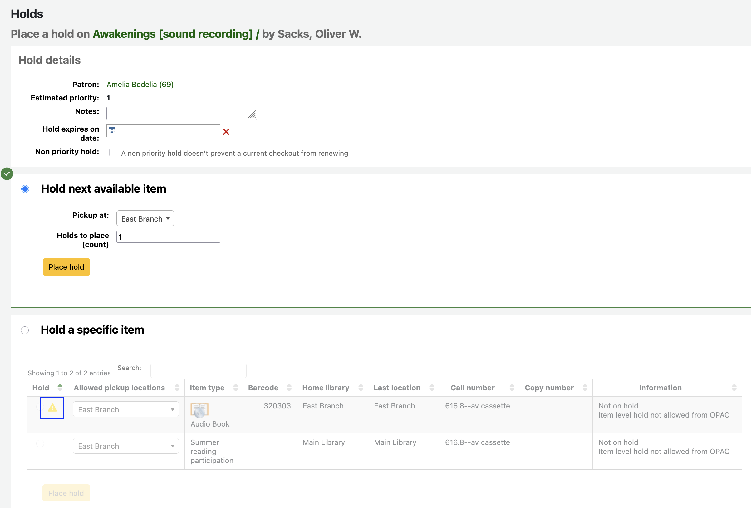 If there are only some items on which patrons cannot place holds per the circulation matrix, there will be no 'Cannot place holds' message, but those individual items will be marked with an exclamation mark in a yellow triangle:
