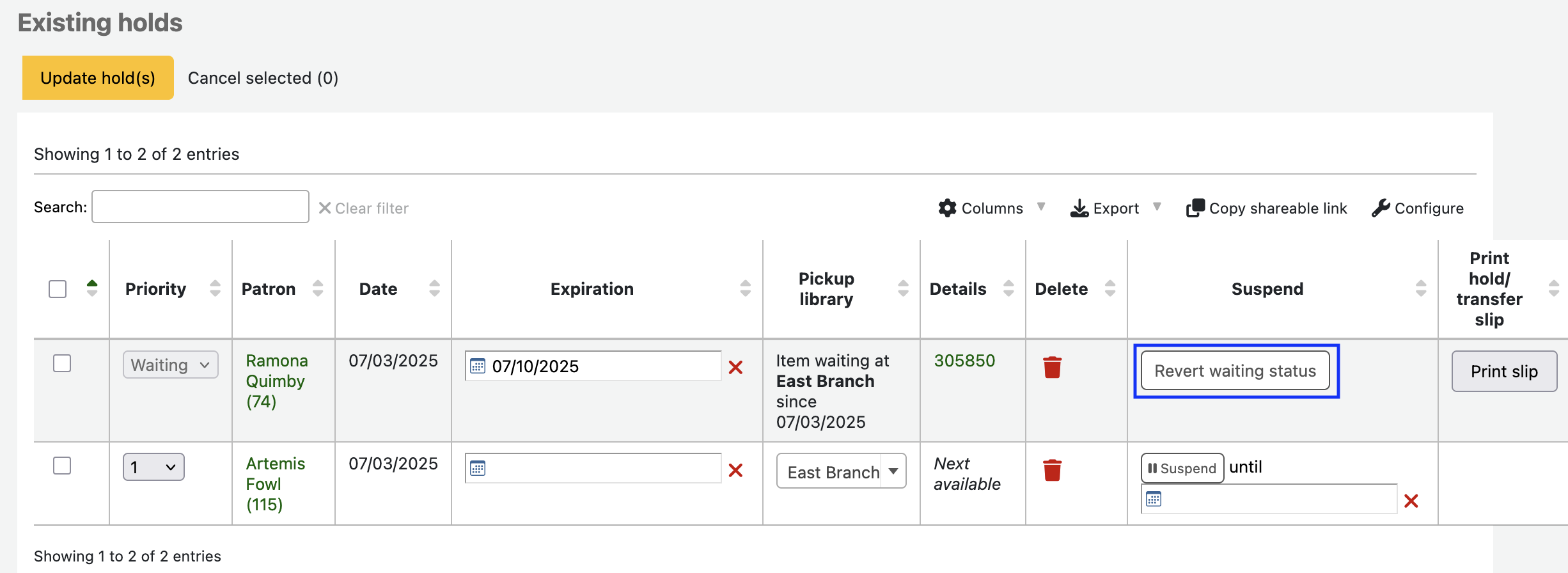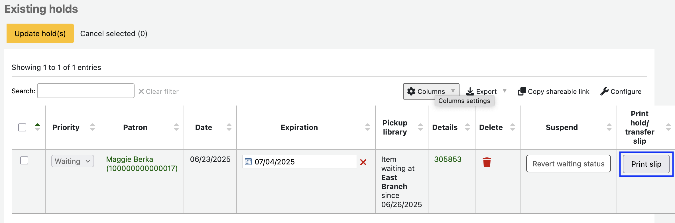 To print a new hold slip with the updated expiration date, click 'Print slip' in the 'Print hold/transfer slip' column: