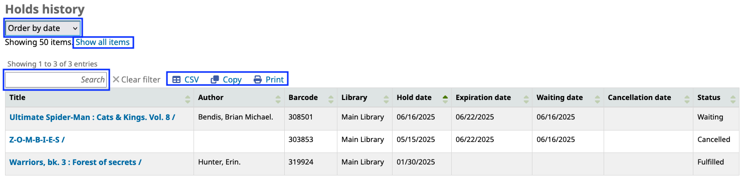 By default, holds history will be in order by the 'Hold date' column, but patrons can choose to order it by title or author instead using the drop-down under the 'Holds history' header. They can also sort the table by any column by clicking on its header.