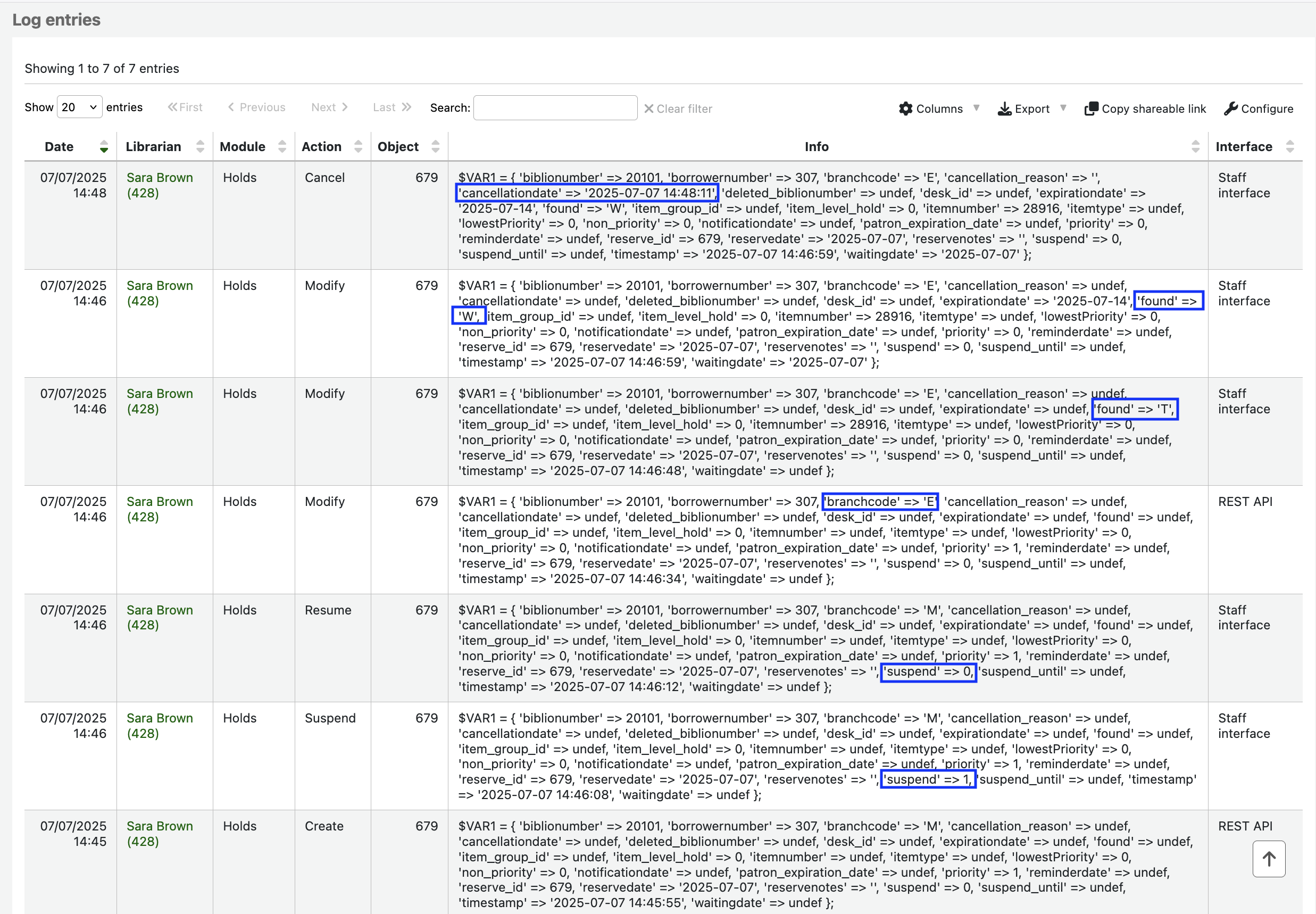 Read hold logs from the bottom up, as the oldest entries will be at the bottom. For this example, we can see that the hold was placed on 7/7, suspended ('suspend' =>1), and then unsuspended ('suspend' =>0). It then had its pickup location changed from M to E ('branchcode' => 'E'), was found and put into transfer ('found' => 'T'), and set to waiting once it arrived at E ('found' => 'W'). Finally, it was cancelled (Cancel in the 'Action' column, and 'cancellationdate' => '2025-07-07 14:48:11').