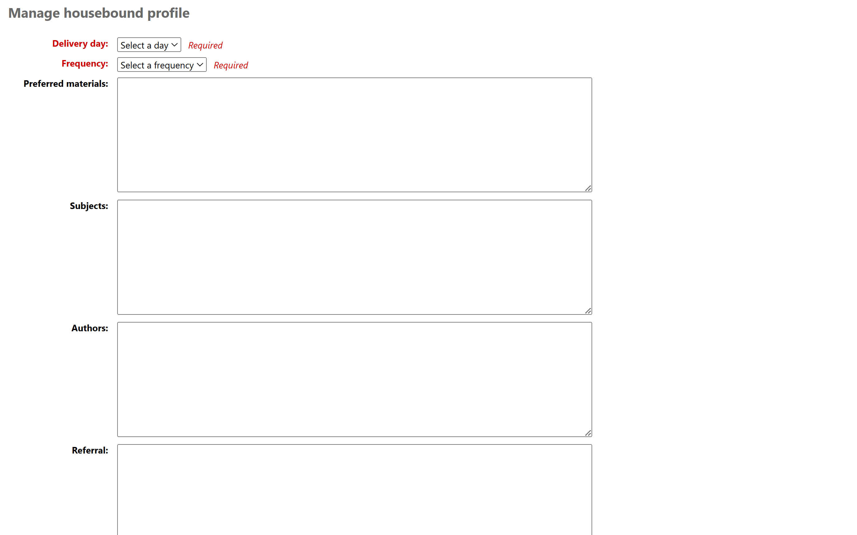 When on a housebound patron account, there is a new tab on the left that will say "Housebound." Clicking this tab will bring this screen: