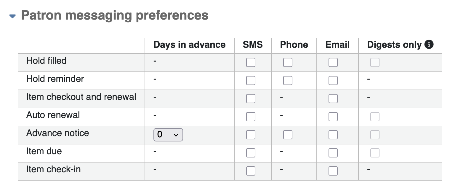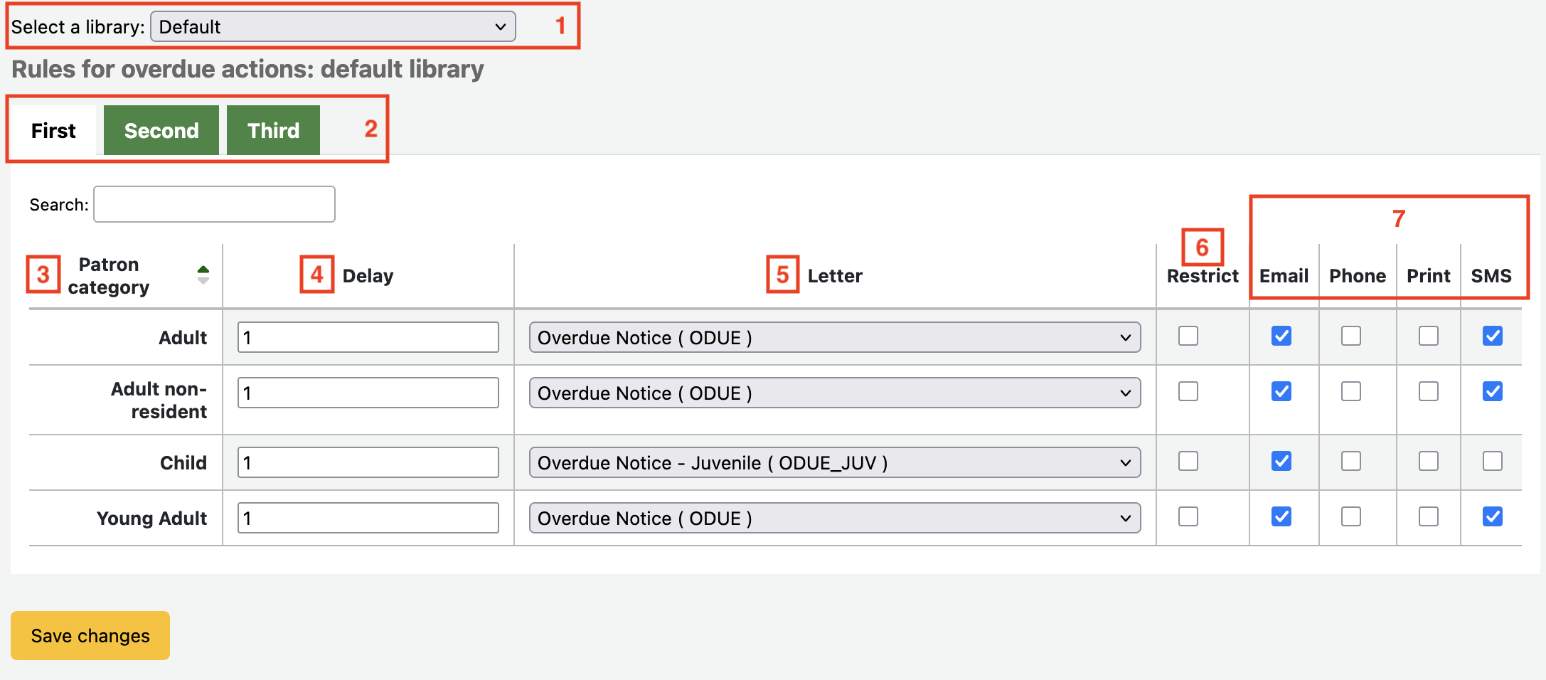 Advance notice Code: PREDUE (digest: PREDUEDGST) | A reminder X number of days before the due date for soon-to-be-due items (select number for X in drop-down) | PREDUE: Issuing PREDUEDGST: Patron home by default; can set cron to send one digest per issuing branch | PREDUE: Issuing by default; can set to send from item's home branch in cron PREDUEDGST: Patron home by default; issuing if using digest per branch | -Requires the advance_notices.pl cron |