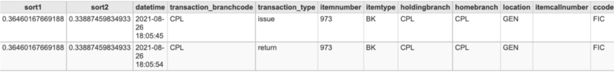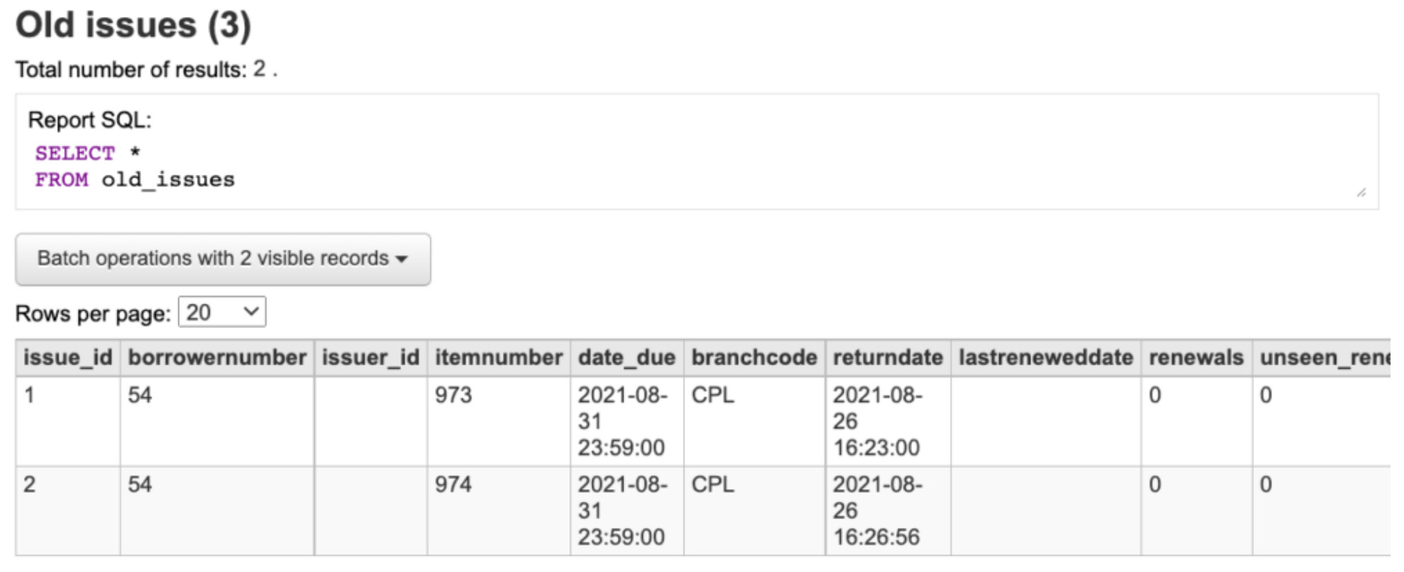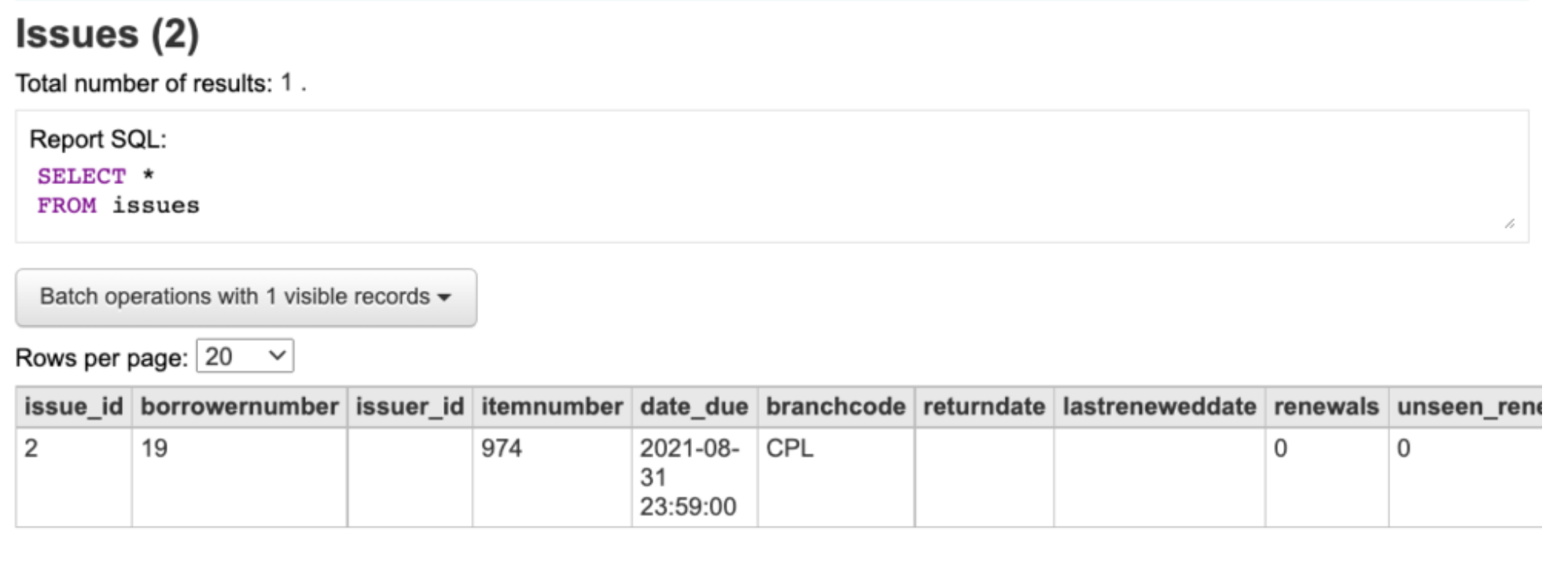 The issues table shows the patrons borrowernumber: 19. Here's that same checkout after the item was returned: