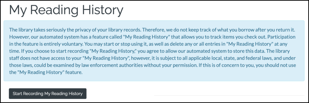 When visiting Reading History for the first time, if a user has never opted in to reading history before, Aspen displays a message explaining what reading history is and possible implications for privacy. (This message can also be modified using Aspen's Translation Mode if you need to add more information specific to your library's policies.)