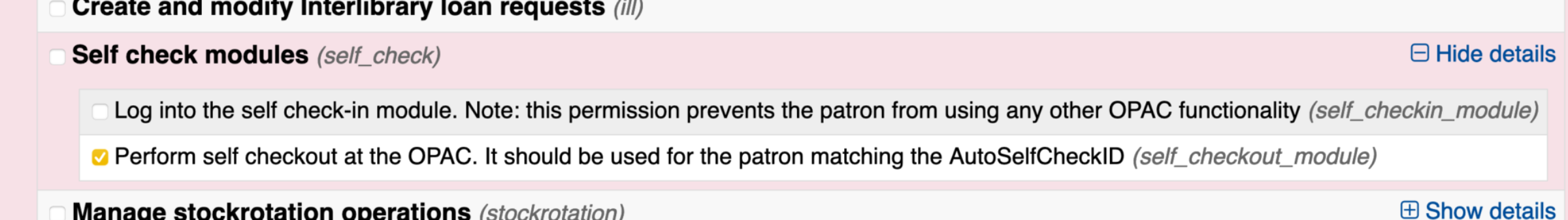 The next option for self checkout is the ability for this module to be logged in automatically. This system preference if turned on, will require libraries to create a self check patron in Koha and attach the permissions.